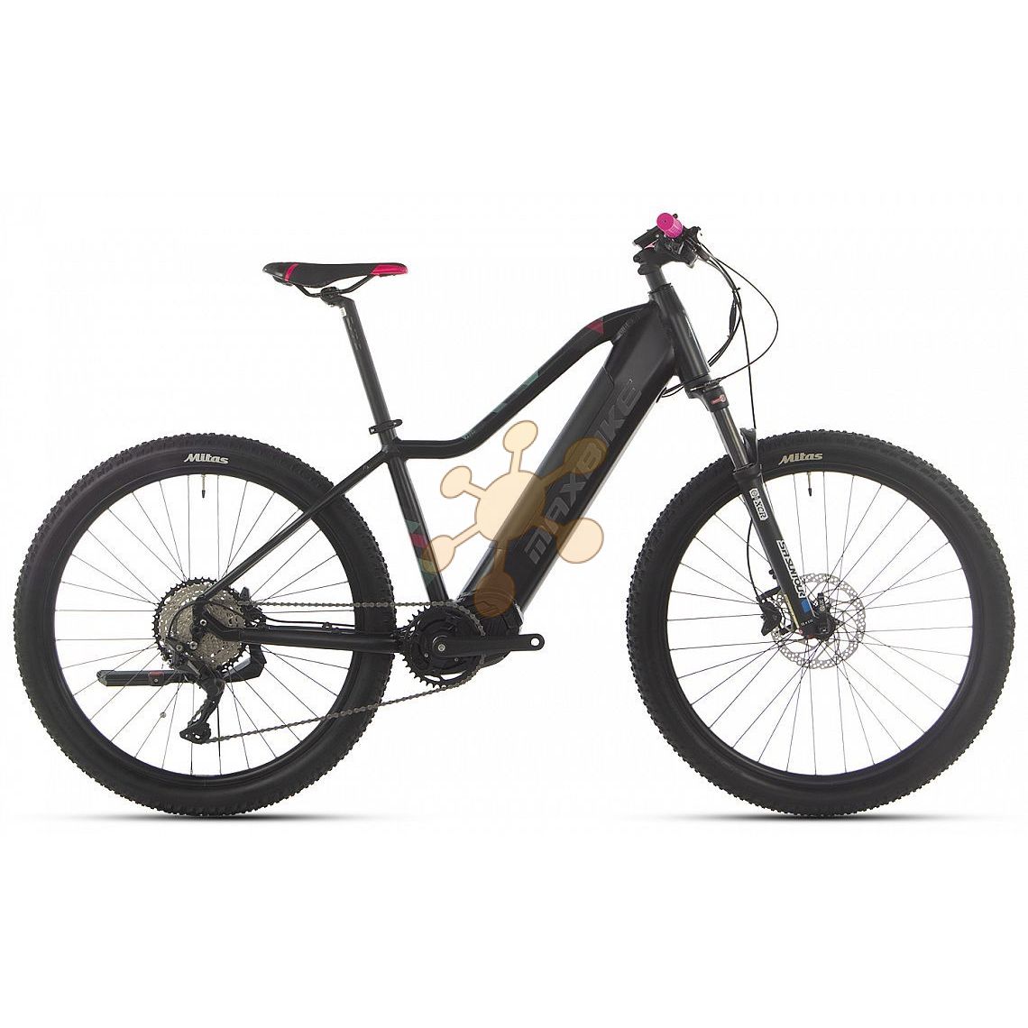 1x10 dámske hardtail 27,5" horský elektrobicykel so stredovým motorom Bafang M410 (250 W, 80 Nm), do rámu plne integrovaná batéria Aucopo 720Wh, 20Ah, 36V, s článkami Samsung, vidlica Suntour XCR AIR BOOST RL zdvih 1 prehadzovačka Shimano Deore RD-M5120, brzdy Shimano MT400 Dodávané veľkosti: M a L